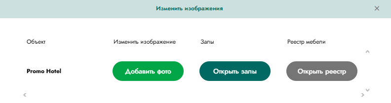 Также при регистрации каждому клиенту задаётся фиксированный набор объектов и залов. Для примера далее по тексту это отель «Promo Hotel» и три зала.