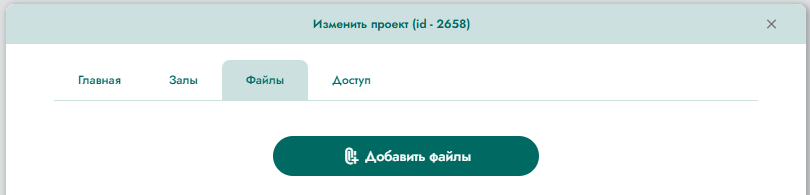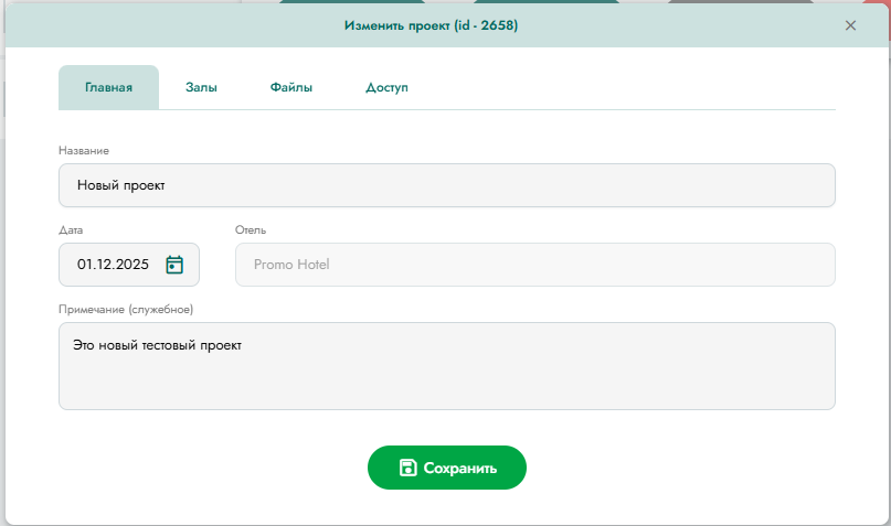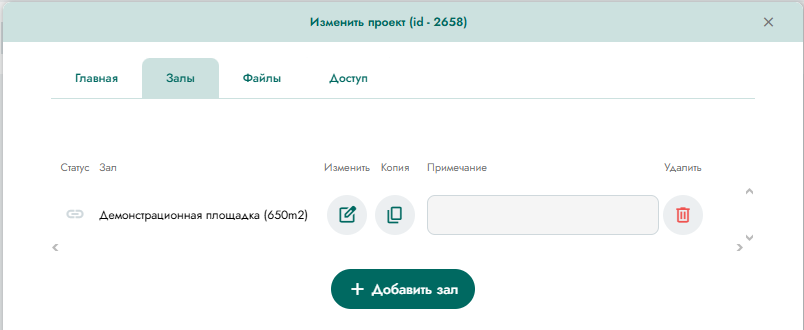 Войти в режим редактирования можно или явно нажать на соответствующую кнопку (см. раздел «Работа с проектом»), или просто кликнуть левой кнопкой мышки на строкке соответствующего проекта в общем списке. При выборе режима редактирования проекта открывается окно с доступными для редактирования основными полями (Рисунок 4), формой для прикрепления файлов (Рисунок 5), формой для задания пароля доступа (Рисунок 6) и формой работы с залами (Рисунок 7).